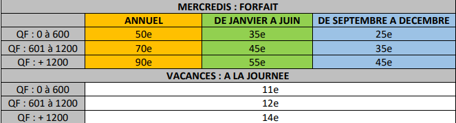 Voici les tarifs proposés en tenant compte du quotient familial :